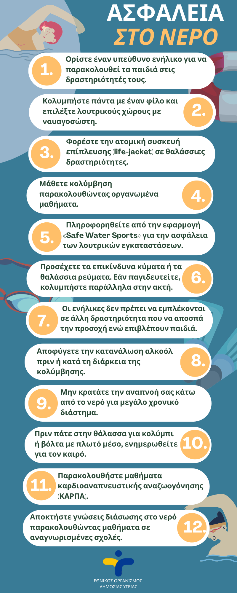 Ο Εθνικός Οργανισμός Δημόσιας Υγείας σε συνεργασία με τον μη-κερδοσκοπικό Οργανισμό Safe Water Sports, παροτρύνει όλα τα άτομα και ειδικά τα άτομα τρίτης ηλικίας να απολαμβάνουν τη θάλασσα, αλλά πάντα με ασφάλεια μέσα από την ενημερωτική καμπάνια που συνεχίζεται και φέτος το καλοκαίρι.